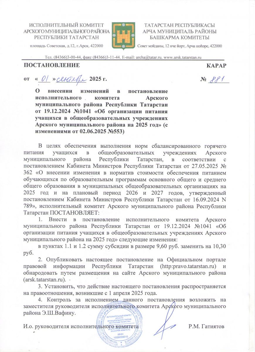 - Приказ МУ "Управление образования" Арского МР РТ "Об организации питания учащихся в ОУ Арского МР в 2025-2026 учебном году" № 277 от 02.09.2025 года