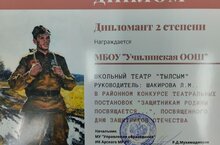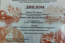 "Бөек Җиңүнең яшь геройлары" исеме астында узучы республикакүләм конкурсның муниципаль этабында "Тылсым" театр коллективы укучылары (Закирова Рәзинә,Абдрахманов Әмир,Сибгатуллин Раяз) "Шинельсез солдатлар"спектакле белән 2 урынга лаек булды. Җитәкчесе тәрбия эшләре буенча директор урынбасары Л.М. Шакирова. Котлыйбыз! Киләчәктә дә уңышлар телибез!