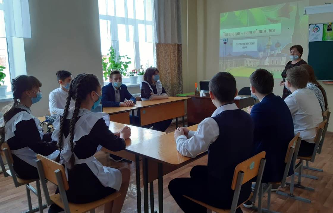 "Татарстан - уртак йортыбыз. Дуслык белән көчле без." исеме астында 8-9 нчы сыйныф укучылары белән парламент дәресе узды. Дәрес Татарстанда игьлан ителгән Туган телләр һәм халыклар бердәмлеге елы уңаеннан туган телебезне саклауга багышланды. Ахырдан укучылар викторина сорауларына җавап бирделәр. -