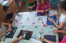 Ко дню космонавтики дети подготовительной группы выполнили аппликацию "Ракета".