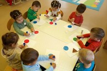Кечкенәләр төркемендә кисеп ябыштыру. Эш башында төсләрне һәм геометрик фигураларны өйрәнәләр.
