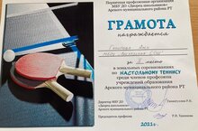 Воспитатель нашего детского сада Гарипова А.Д. участвовала в зональных соревнованиях по настольному теннису среди членов профсоюза учреждений образования Арского муниципального района РТ и была награждена грамотой за 2 место. Поздравляем!!!