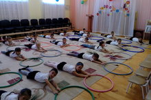 Воспитанники старшей группы на занятии физкультуры выполняли упражнения с обручем. Такие упражнения способствуют формированию правильной осанки, улучшают состояние дыхательной и сердечно-сосудистой системы, дают разностороннюю тренировку координации движения, зрительной, слуховой, моторной памяти, ловкости. Воспитывают стремление выполнить упражнение не только правильно, но и красиво, легко, способствуют умению согласовывать движение различных частей тела.