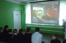 Во время перемен в актовом зале организовали показ мультфильмов на иностранном языке.