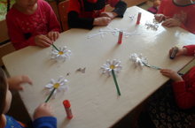 Балалар белән чәчәкләр турында сөйләшкәннән соң ак туры тасмалардан матур чәчәкләр ябыштыру. Келәй. кайчы белән сак, чиста-пөхтә эшли белүне камилләштерү, матурлык тудыра белергә өйрәтү.