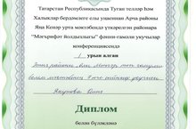 Арча районы Яңа Кенәр урта мәктәбендә уздырылган "Мәгърифәт йолдызлыгы" районара фәнни-гамәли конференциясендә 7нче сыйныф укучысы Якупова Динә 1нче урынга лаек булды. Җитәкчесе Сәләхетдинова Х.Х.