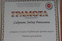 3 апрель көнне, Яшел Үзән шәһәренең №10 гимназиясендә, Яшүсмерләрнең Каюм Насыйри исемендәге XIII төбәкара фәнни-тикшеренү укулары узды. "Туган якны өйрәнү" секциясендә мәктәбебезнең 8 нче сыйныф укучысы Садриева Энҗе I урынны алды ( җитәкчесе Садриев Равил Мөхтәр улы).ТР М һәм Ф министрлыгының дипломы белән бүләкләнде. Зур уңышлары белән котлыйбыз!!! 05.04.2015