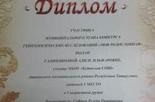 30 апреля 2020 года прошел муниципальный этап конкурса "Моя родословная". Ученица 3 класса Галимзянова Алиля Ильфаровна (руководитель Сафина Р.Р.) заняла 1 место. Поздравляем Адилю!