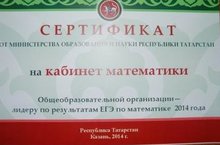 Сертификат от министерства образования и науки Республики Татарстан на кабинет математики общеобразовательной организации - лидеру по результатам ЕГЭ по математике 2014 года
