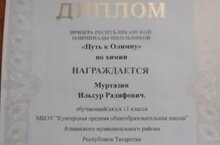 Диплом призера республиканской олимпиады школьников "Путь к Олимпу" по химии 13.01.2022