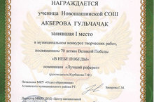 "Иң яхшы реферат" номинациясендә 9 сыйныф укучысы Акберова Гөлчәчәкнең "Яугир авылдашым" эзләнү эше I урын яулады,7 сыйныф укучысы Җиһаншин Ранил III урын алды.