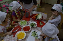 Особенно популярен среди наших детей центр кулинарии. Вот и сегодня дети подготовительной группы приготовили очень вкусный овощной салат.