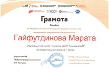 Поздравляем ученика 11го класса Гайфутдинова Марата, который стал призером IV Республиканской олимпиады по предпринимательству, финансовой и потребительской грамотности. Молодец!
