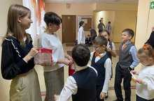 На перемене учащиеся гимназии принимали участие в викторине и получили сладкие презенты за правильные ответы. -