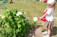 Для современных детей, особенно в условиях города, трудовое воспитание имеет особое значение. В процессе труда у них воспитывается любовь к природе, бережное отношение к ней, развивается интерес к трудовой деятельности, сознательное, ответственное отношение к труду взрослых. Воспитанники нашего детского сада приучаются трудиться сообща, вместе помогать друг другу. Наличие огорода в детском саду способствует осуществлению непосредственного контакта ребёнка с объектами природы, наблюдения и практической деятельности по уходу за растениями. И, конечно же, за растениями нужен уход. Дети совместно с воспитателями пропалывают грядки от сорняков, рыхлят и поливают растения. И с нетерпением ждут первых плодов – результатов своей деятельности.