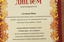 Воспитанник 6 группы Ахтямов Нияз занял 3 место в районном конкурсе чтецов "Родина наша - нет ее краше!", среди воспитанников логопедических групп в номинации "Мин яратам сине, Татарстан"