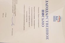Благодарность от Партии "Единая Россия" за плодотворное сотрудничество в реализации партийных проектов и активное участие в общественно - политической жизни района.