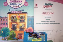 Ученица 1А класса награждёна дипломом за активное участие в проекте «Дневник добрых дел». Поздравляем!!!