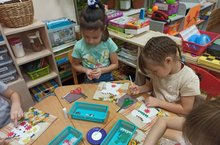 На занятиях по аппликации воспитанники подготовительной к школе группы изображают элементы орнаментов народов Поволжья. Сегодня они изображали элементы удмуртского орнамента на платье, активно и творчески применяли ранее усвоенные способы изображения в аппликации, самостоятельно подбирали цвета, исходя из особенностей колорита удмуртского орнамента.