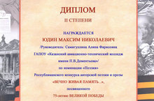 - Поэзия – Юдин М., гр. 17Л1, стихотворение собственного сочинения «Руины Мира», диплом II степени (руководитель Самигуллина А.Ф.);