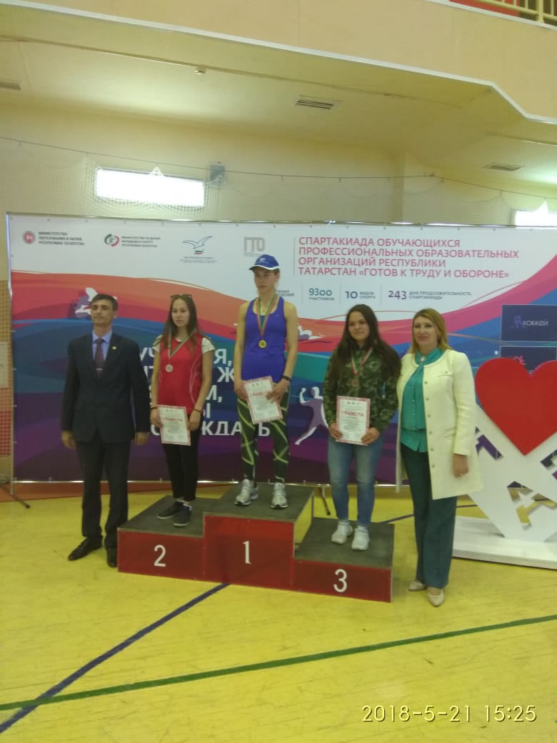 Студент Туйчин Азат занял 1 место в личном первенстве по метанию снарядов, Шавалиева Дилара заняла 1 место по бегу на 2 км., Колядов Андрей занял 2 место по подтягиванию на высокой перекладине. По итогам соревнований Шавалиева Дилара, студентка группы 17КС1, заняла 2ое место в абсолютном первенстве по студенческому многоборью ГТО. Наша сборная заняла в Спартакиаде 6 общекомандное место из 69 команд!