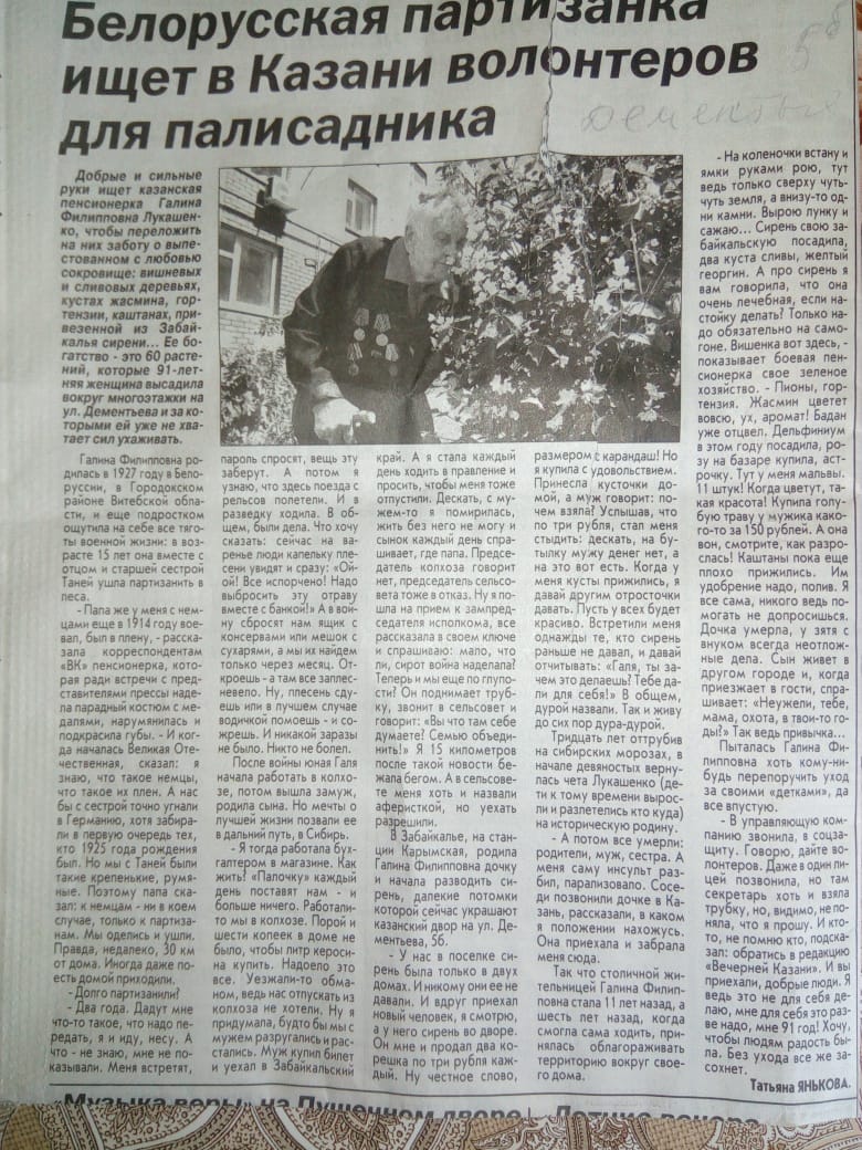Добрые и сильные руки искала пенсионерка Галина Филипповна Лукашенко, чтобы ей помогли в уходе за ее сокровищем – палисадником у дома на ул., Дементьева где она высадила свои любимые цветы и кустарники. Участница ВОВ, белорусская партизанка, написала письмо в «Вечернюю Казань» с обращением к добрым людям, которые помогли бы ухаживать за садом.
