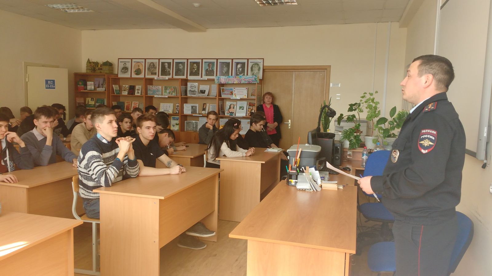 Опубликовано: 26.03.2019Сегодня 26 марта 2019г. в колледже прошла встреча с участием старшего инспектора по ИАЗ отделения по Авиастроительному и Ново-Савиновскому районам ОГИБДД ИМВД России по г.Казани капитана полиции Газизовым И.М. со студентами 1 курса.