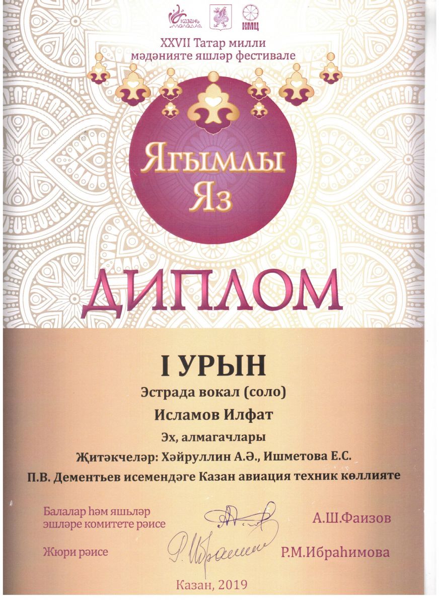 В конце марта наши студенты приняли участие в Республиканском конкурсе «Ягымлы Яз». Ребята представили на суд жюри свои творческие номера в таких номинациях как: эстрадный татарский вокал, татарский народный танец. В состав жюри входили такие известные исполнители татарской эстрады как Римма Ибрагимова. Наш студент 2 курса - Исламов Ильфат занял 1 место в номинации татарский эстрадный вокал! Мы поздравляем его от всей души и желаем новых творческих побед!