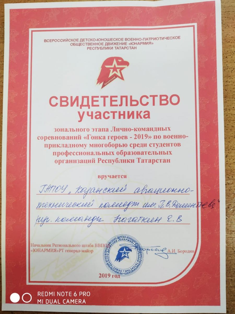 9 октября команда ГАПОУ «КАТК» военно-патриотической направленности «Взлет», под руководством преподавателя физической культуры Нагаткина Е.В., приняла участие в Республиканских лично-командных соревнованиях «Гонка героев» по военно-прикладному многоборью среди команд профессиональных организаций РТ (зона).