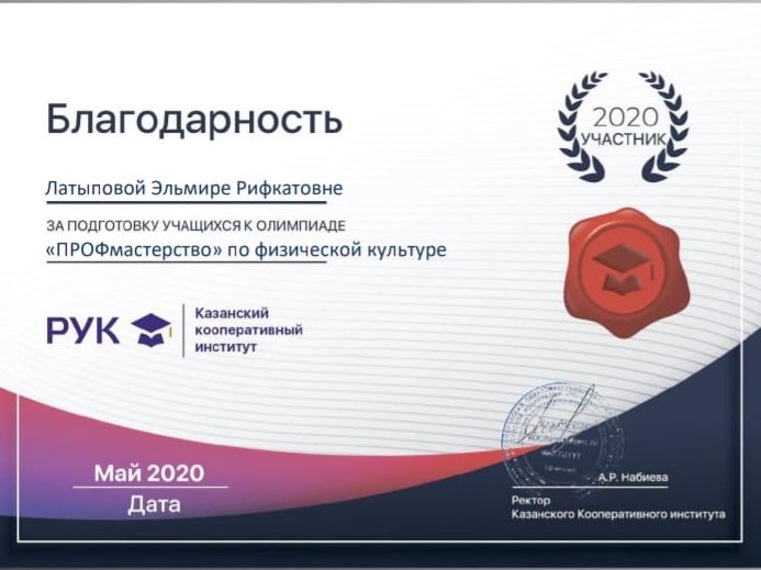 Опубликовано: 08.05.20208 мая 2020 года состоялась дистанционная Олимпиада «ПРОФмастерства» по физической культуре, где студентка нашего колледжа Ахмадуллина Альфия, группа 18Т1, под руководством преподавателя Латыповой Эльмиры Рифкатовны приняла участие и заняла призовое III место.