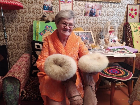 В военные годы, будучи ребенком она работала на меховой фабрике и до сих пор продолжает шить чуни (домашнюю обувь) и радует своих близких. Из близких у нее остался только внук Дмитрий, который живет в Санкт-Петербурге. В условиях пандемии Вера Георгиевна давно не виделась с внуком, и волонтеры позвонили ему по видеосвязи. Вера Георгиевна была счастлива пообщавшись с родственником. Мы всегда готовы оказывать посильную помощь и поддержку, а также поздравляем ее с праздником Победы и желаем здоровья!