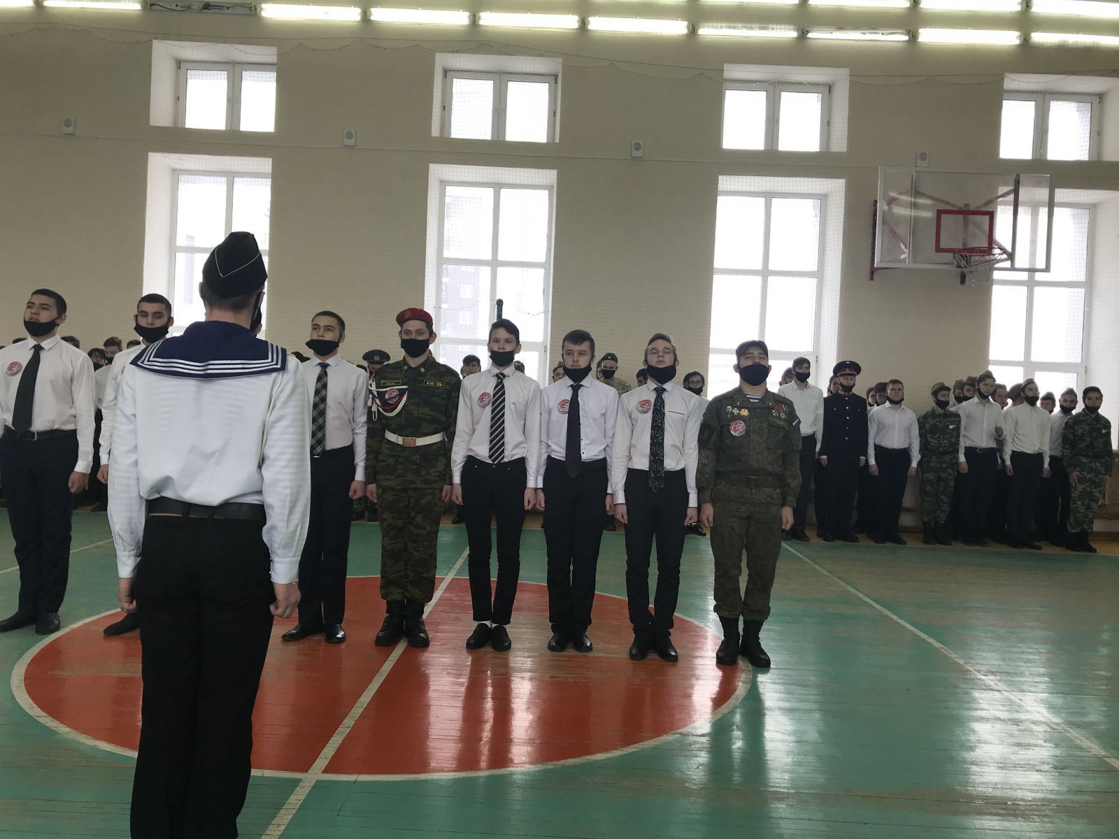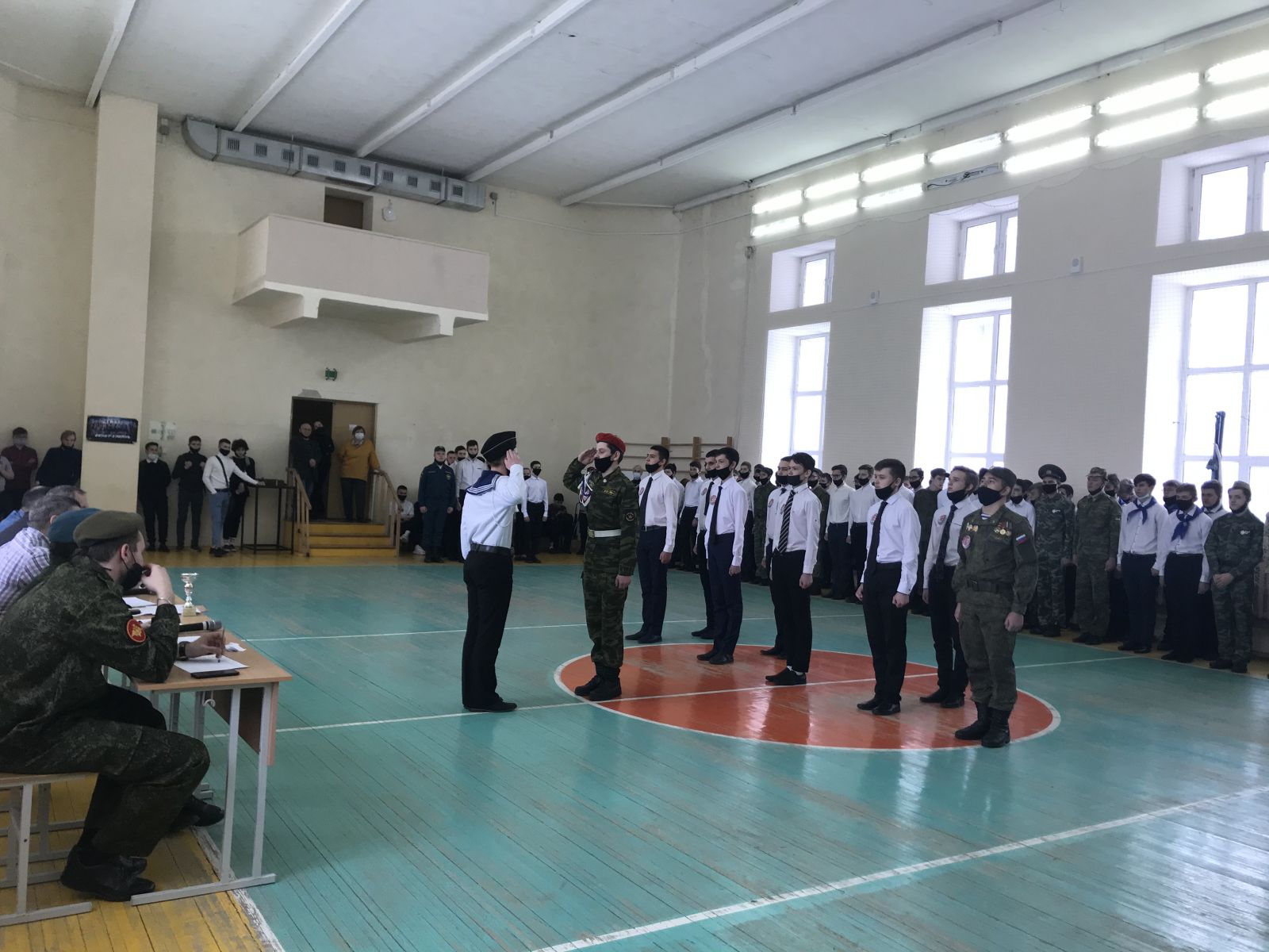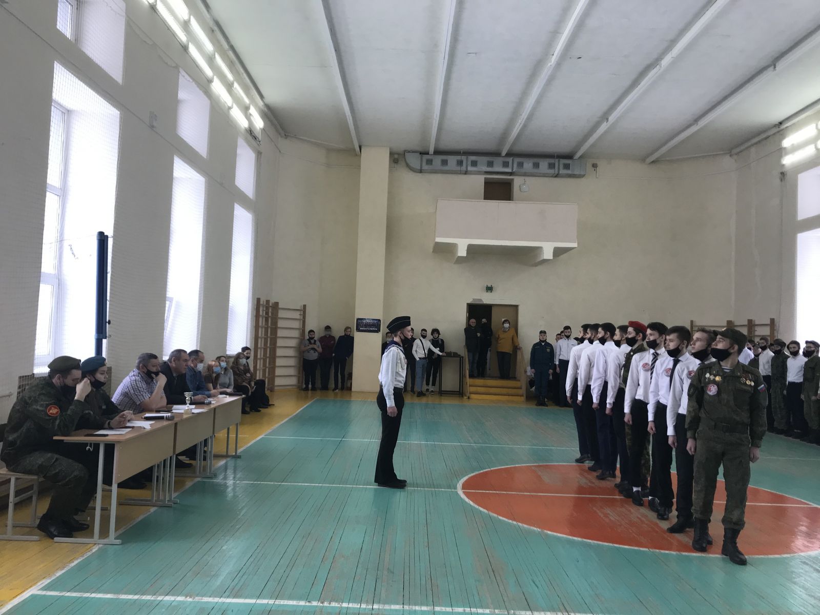 Смотр строя и песни начался с построения всех отрядов в спортивном зале 2-го учебного корпуса. Участники состязались в построении, выполнении строевых задач; командиры уверенно сдавали рапорт судьям. Все желающие могли увидеть четкий строевой шаг и послушать звонкие солдатские песни.