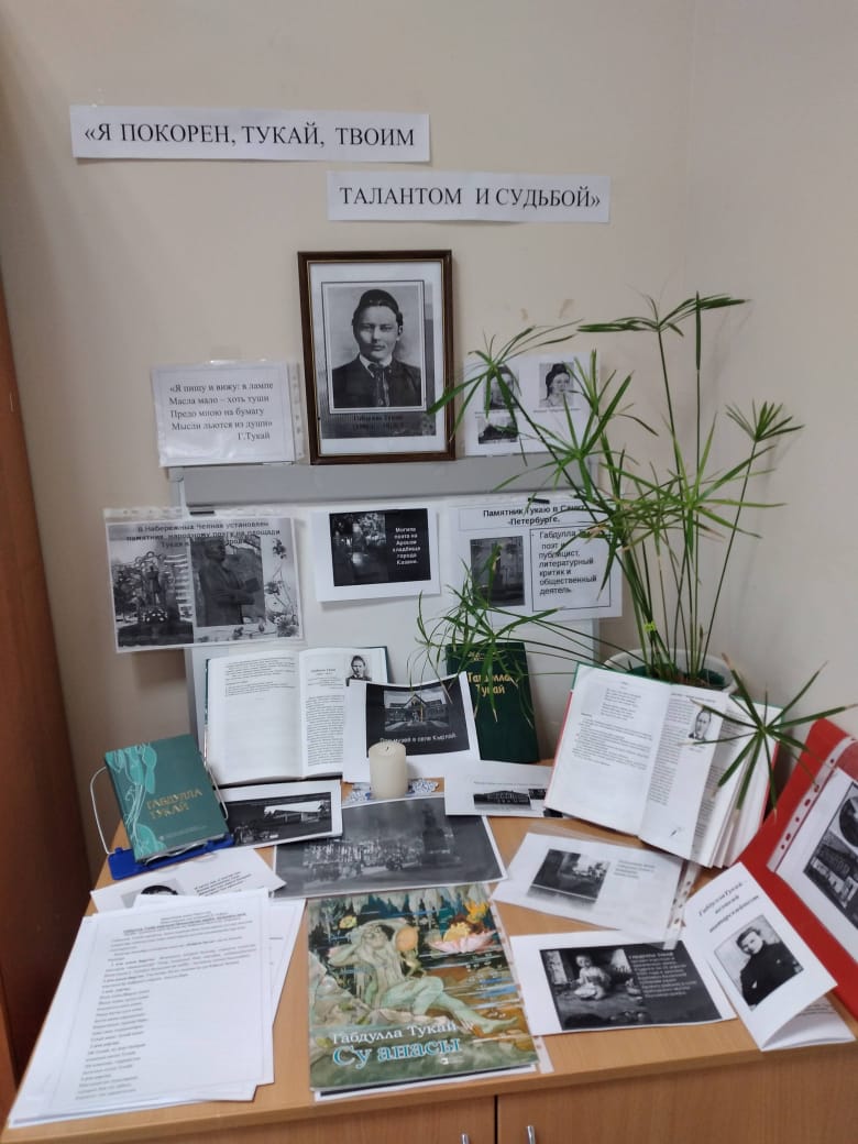 Также, в читальном зале библиотеки организована выставка, посвященная творчеству Г. Тукая : "Я покорен Тукай, твоим талантом и судьбой" .