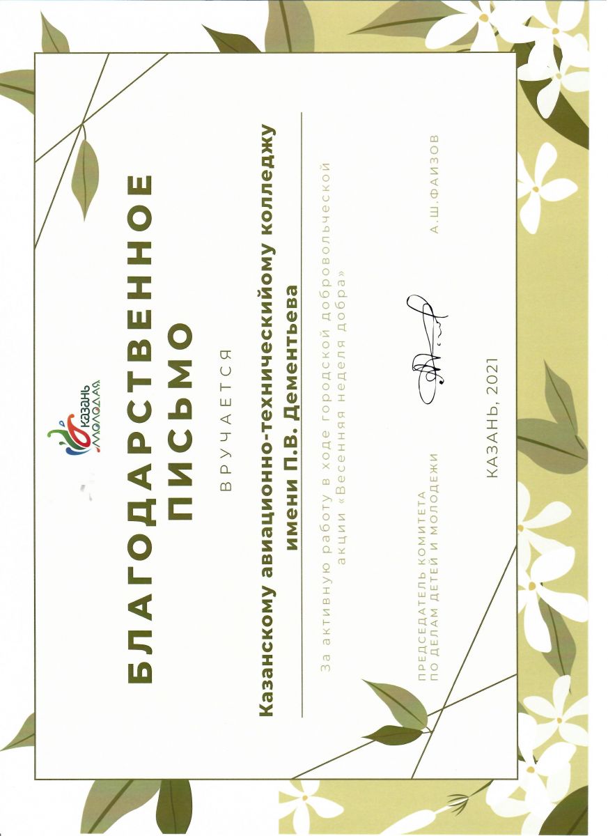 Опубликовано: 30.04.2021Студенты колледжа приняли активнейшее участие в добровольческой Акции «Весенняя неделя добра». По итогам Акции – волонтеры КАТК были награждены благодарственным письмом от Комитета по делам детей и молодежи.