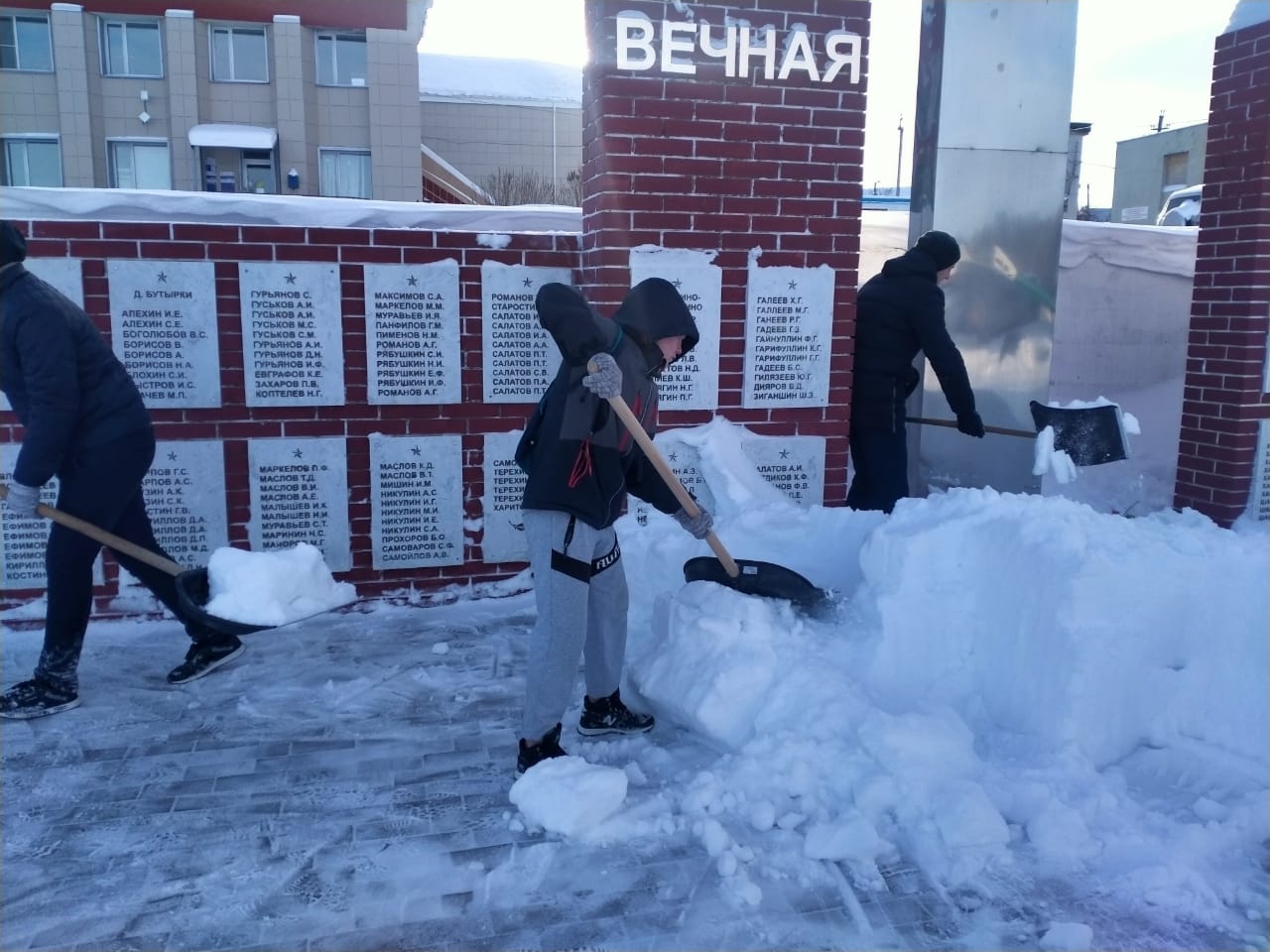 Студенты филиала колледжа Макаров Даниил, Азизов Расим, Гайнутдинов Ильдар, Гуменюк Владислав организовали очистку памятника павшим воинам в Великой Отечественной войне от снега на территории сельского поселения.