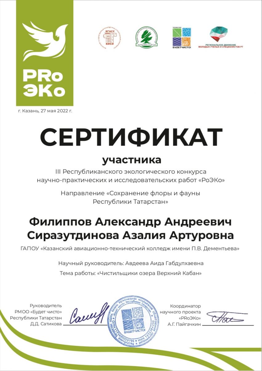 Проект «PRoЭКо» реализуется при поддержке Министерства экологии и природных ресурсов Республики Татарстан. Целью является выявление лучших научно-практических работ среди молодежи в области решения актуальных экологических вопросов. В рамках проекта прошли: