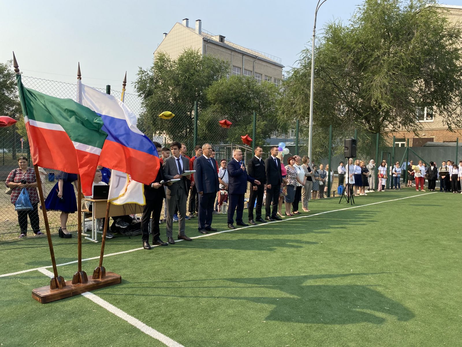 Торжественную линейку открыли с поднятия Государственного флага и гимнов Российской Федерации и Республики Татарстан.
