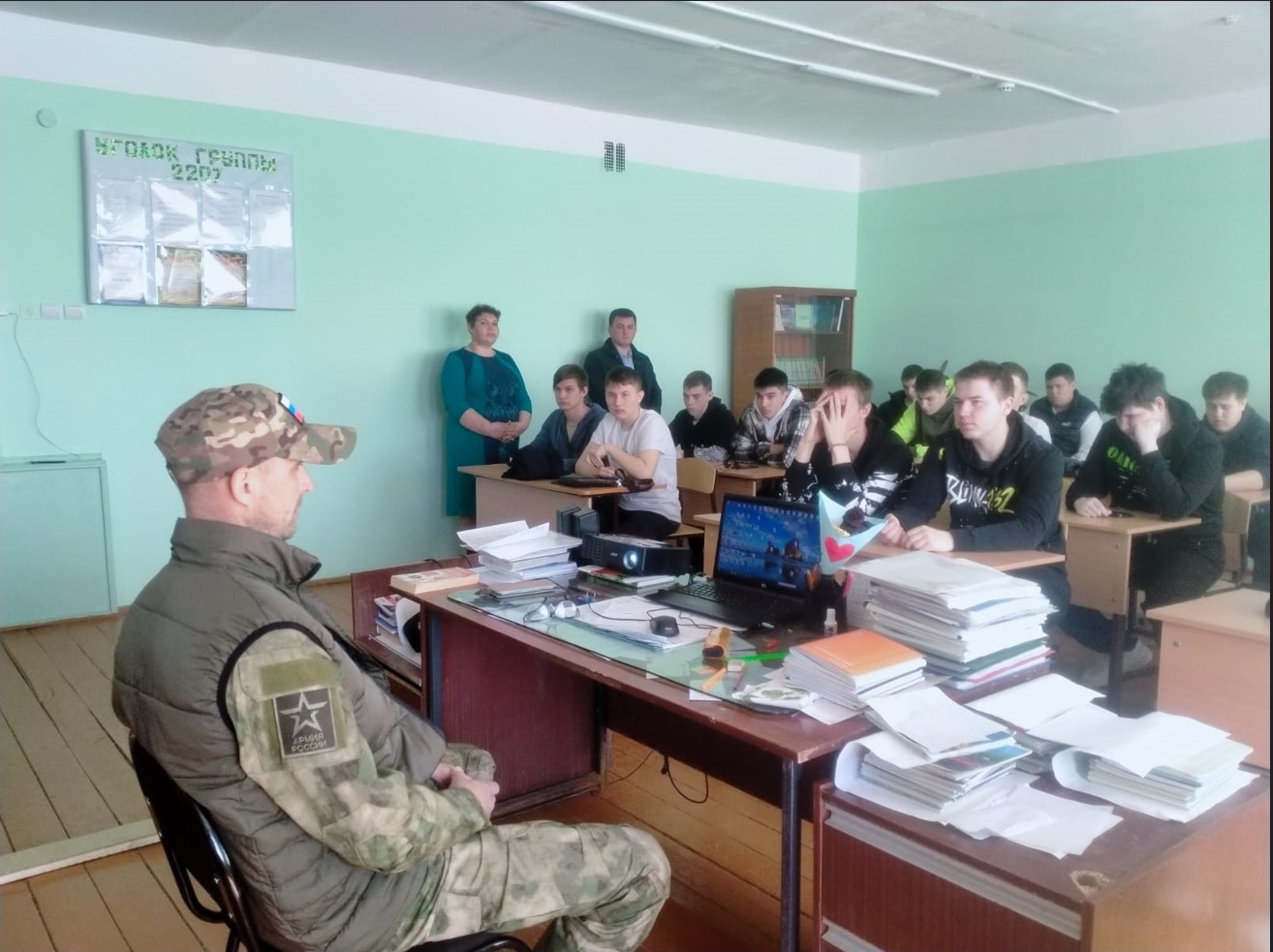 Опубликовано: 04.04.2023Студенты филиала колледжа 4 апреля приняли участие во встрече с участником СВО Александром Буздаловым. На встрече присутствовали Глава Пестречинского района И.М. Кашапов, начальник отдела молодежи Пестречинского района М. Ю. Кузнецова. Говорили о жизненных целях ребят, ценностях, здоровом образе жизни, необходимости повышения компетенций по военному делу.