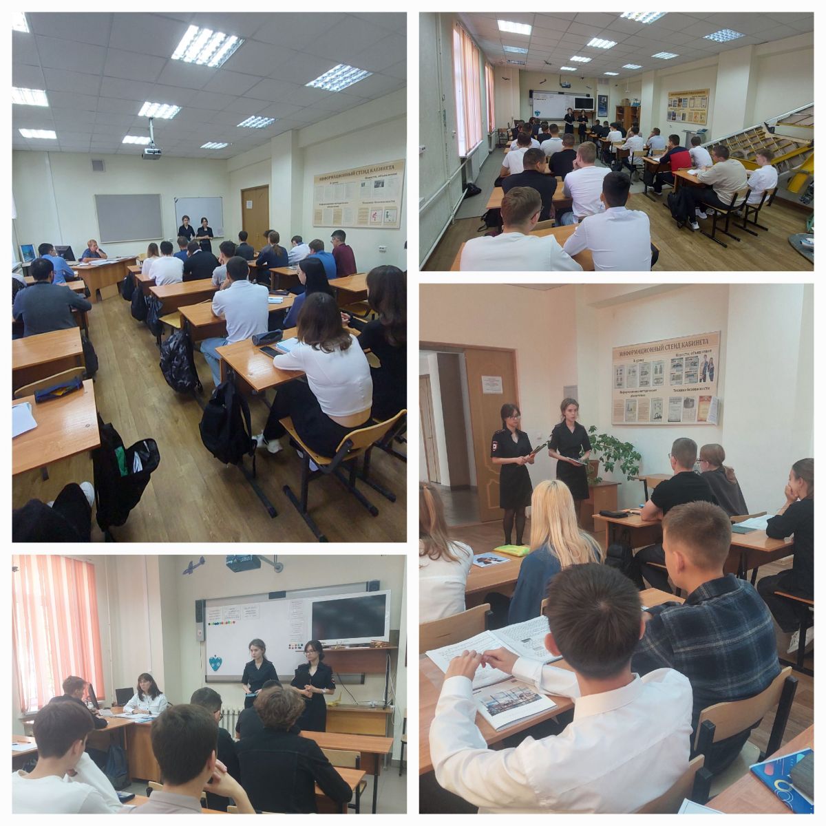 Со студентами проговорили правила внутреннего распорядка колледжа, напомнили о необходимости соблюдений Закона № 71-РТ «О мерах по предупреждению причинения вреда здоровью детей» и ФЗ РФ № 15 (запрет курения в общественных местах), также о профилактике преступлений против личности, вовлечения в религиозные секты и разъяснение ответственности за посещение сайтов экстремисткой направленности, ответственности за публикацию репостов, призывов к нарушению общественного порядка, регистрация на запрещенных сайтах, группах, ответственности за участие в несанкционированных митингах, собраниях, демонстрациях, о важности соблюдений правил дорожного движения, о безопасном поведение при посещении массовых мероприятий, правилах поведения в общественных местах, об уголовной ответственности за совершения преступлений.
