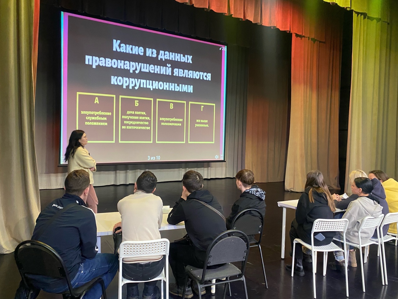 Опубликовано: 18.01.2024Сегодня в Молодежном центре прошла увлекательная квиз-игра на тему “Мы против коррупции!”. В данном мероприятии приняли участие студенты филиала КАТК им. П.В.Дементьева.
