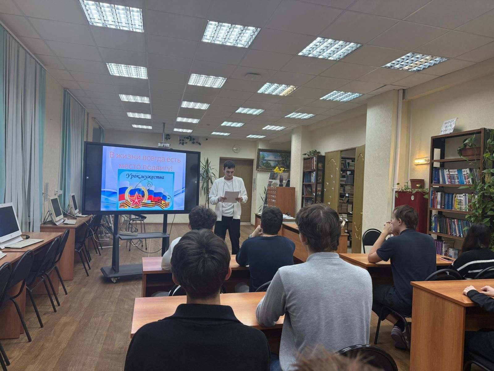 Советник директора провела для студентов Урок мужества «Подвиг во имя жизни»,с рассказом о конкретных примерах героизма сотрудников органах внутренних дел при исполнении служебных обязанностей.