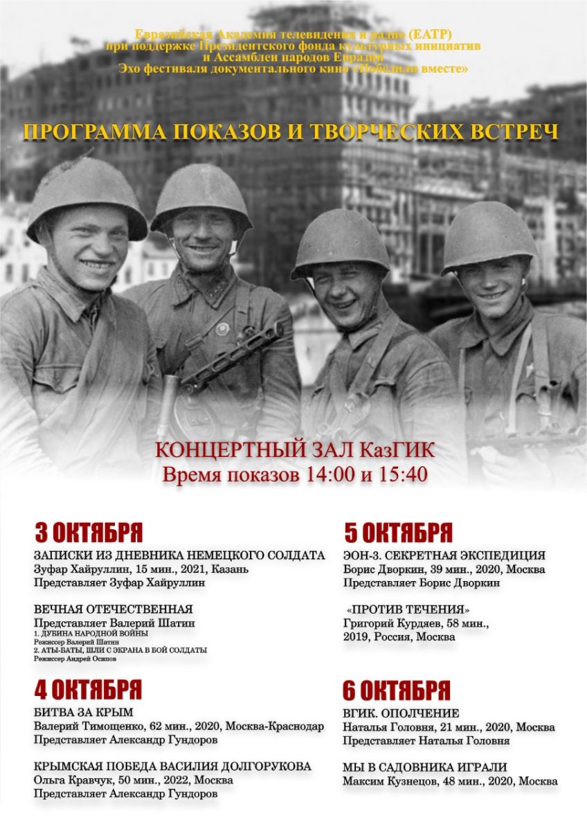 Кинопоказы программы «Эхо фестиваля «ПОБЕДИЛИ ВМЕСТЕ» и мастер-классы с участием авторов и режиссеров фильмов пройдут в период с 3 по 6 октября 2022 г. на базе Федерального государственного бюджетного образовательного учреждения высшего образования «Казанский государственный институт культуры» (далее – КазГИК).