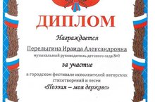Перелыгина Ираида Александровна была награждена дипломом за участие в городском фестивале исполнителей авторских стихотворений и песен "Поэзия - моя держава", который прошел в доме работников образования. Поздравляем!