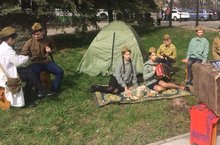 7 мая на площади перед ДК Ленина был организован концерт посвященный празднованию Дня Победы. Школами в этот день были организованы военные привалы. Ученики нашей гимназии приняли активное участие в данном мероприятии и попытались показать привал в котором медсестра госпиталя оказывала помощь раненому солдату, а военные друзья поддерживают больного веселыми песнями.
