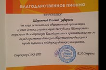 Поздравляем педагога-организатора - Шарипову Розалию Зуфаровну с получением благодарственного письма от лица региональной общественной организации за вклад в развитие детского общественного движения г.Казани и поддержку детских инициатив