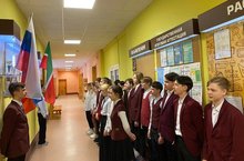 Право открыть эту учебную неделю предоставилось ученикам 7Б класса. Ребята вынесли и установили флаги Российской Федерации и Республики Татарстан, исполнили гимны.