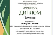 Поздравляем Макарова Алексея с Дипломом 1 степени в Поволжском конкурсе эстрадного мастерства детских и юношеских творческих коллективов «TATARSTAN.ru” . Алексей со своими педагогами-наставниками отправлял видео песни , авторами слов которой являются его родители , а музыка - это знаменитая Песня Остапа Бендера из кинофильма «12 стульев». Видео выступления можно посмотреть по ссылке. https://youtu.be/c_z54f2M1c4