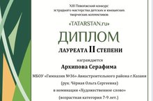 Поздравляем Архипову Серафиму с Победой - Дипломом Лауреата 2 степени в Поволжском конкурсе эстрадного мастерства детских и юношеских творческих коллективов «TATARSTAN.ru”. Видео выступления можно посмотреть по ссылке https://photos.app.goo.gl/Az8x2Xey7GovgFVt5 Руководитель: Чёрная Ольга Сергеевна