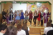 Новогодние праздничные мероприятия проходят в лекционном зале. Дедушка Мороз, Снегурочка и сказочные герои пришли в гости к детям и родителям гимназии. Звучат новогодние песни, шутки.
