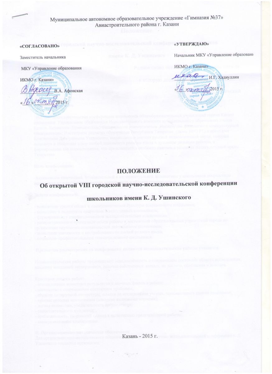 28 ноября 2015 года состоится VII городская научно-практическая конференция учащихся 5-11 классов им. К.Д. Ушинского на базе МАОУ «Гимназия №37» по адресу ул.Копылова д.13 (метро ст. Авиастроительная).